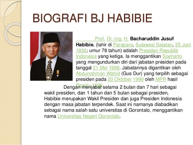 Tuti marini puspowardojo, a javanese noblewoman from yogyakarta, met while studying in bogor. Bj habibie merupakan ikon kebanggaan di indonesia. Dimasa kecil, habibie telah menunjukkan kecerdasan dan semangat tinggi pada ilmu pengetahuan dan teknologi khususnya fisika. Dalam tahun, belum tentu lahir seseorang seperti habibie. His parents, alwi abdul jalil habibie, an agriculturist of gorontalese descent, and r.